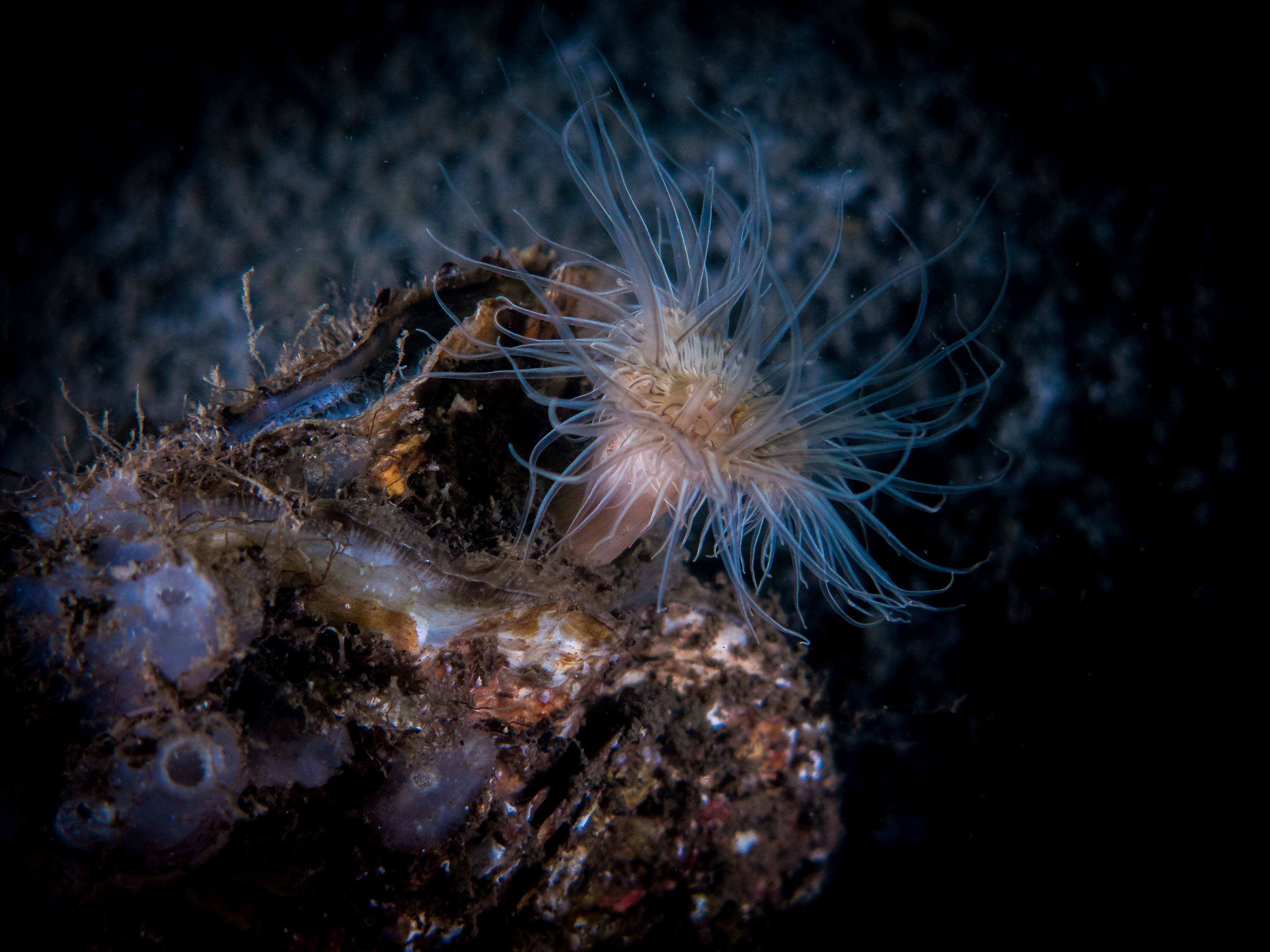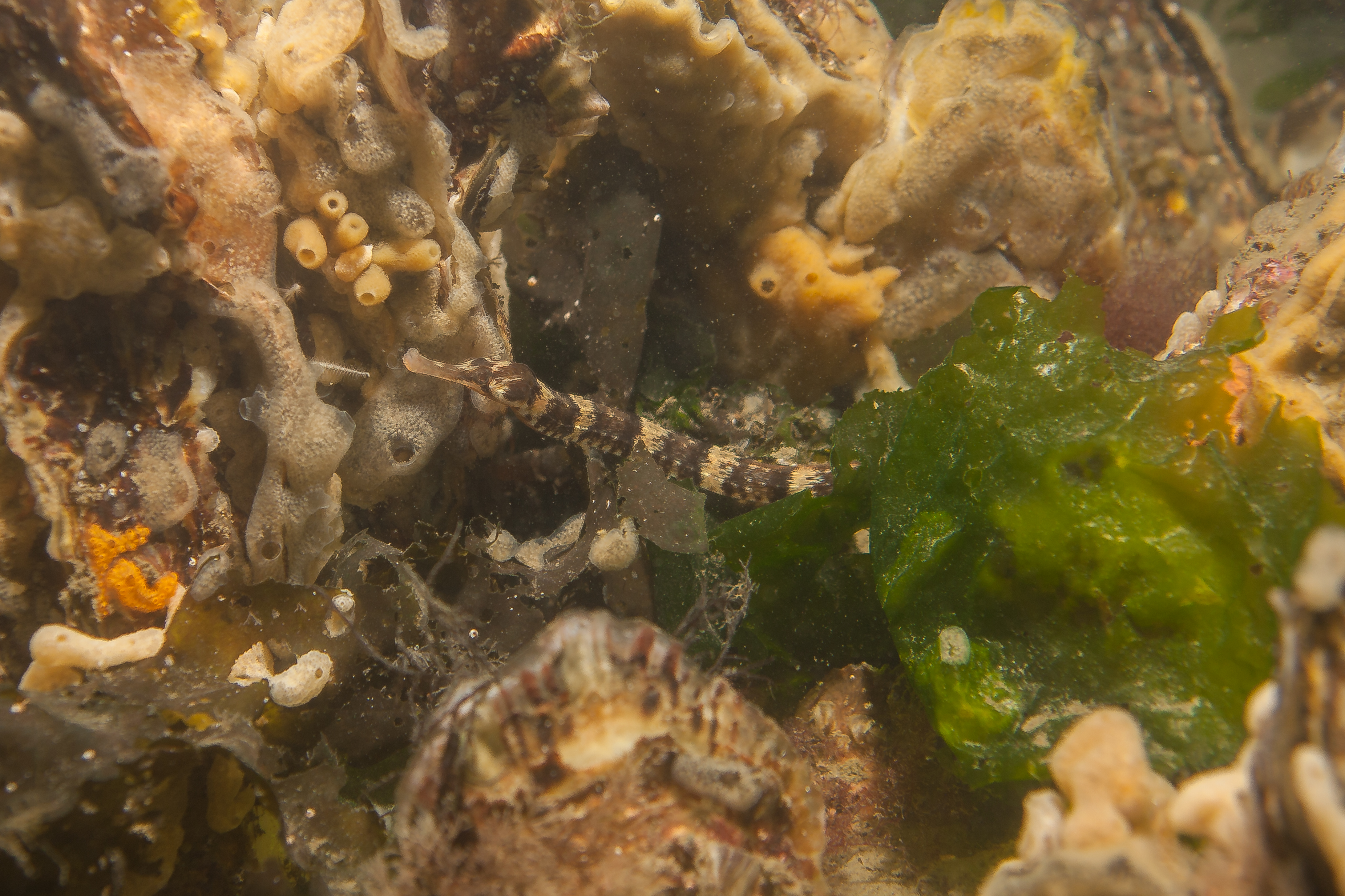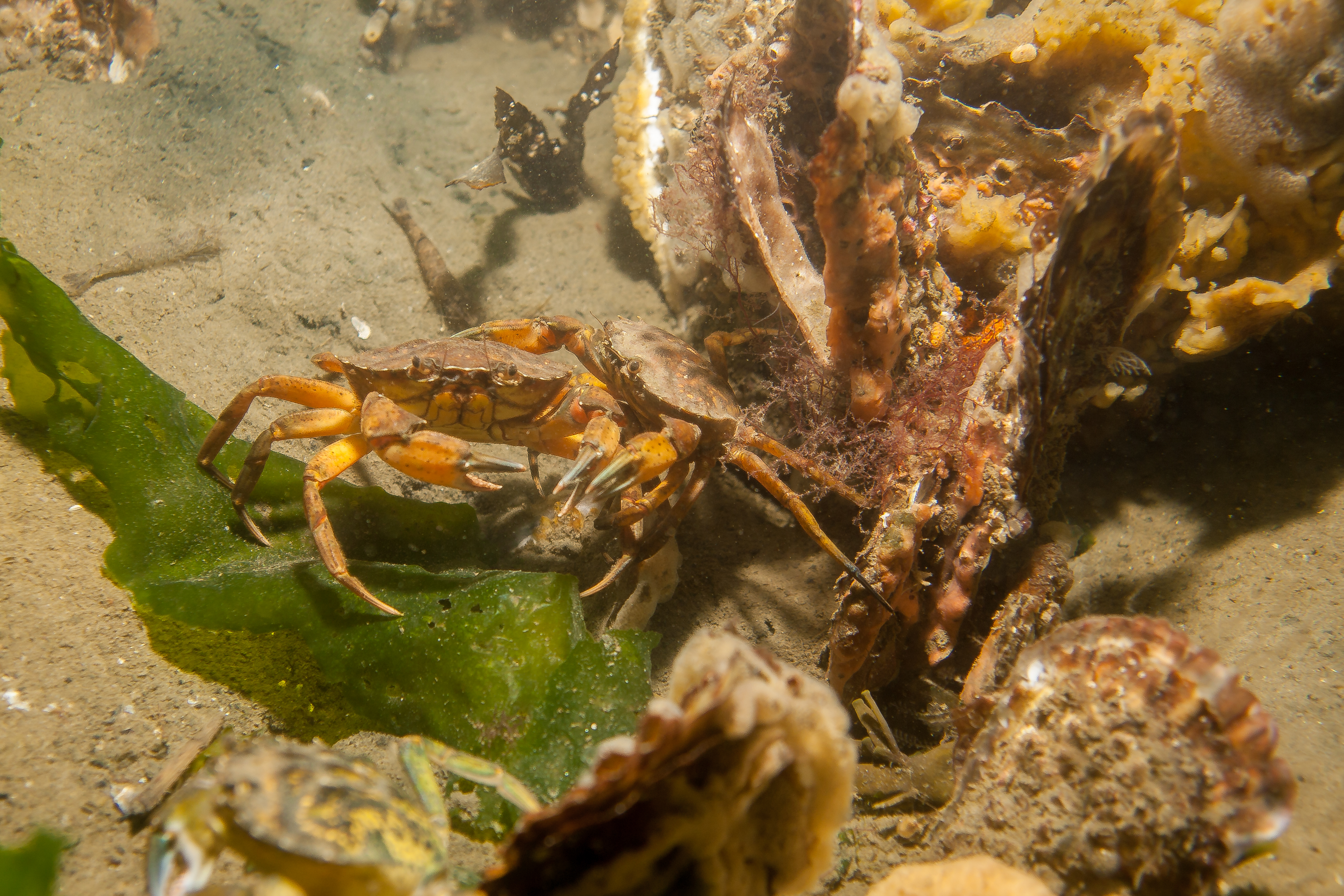 Als je linksaf duikt vanaf het strandje dan vind je na enige tijd een groot rif met veel bekend leven zoals je die vind in de Oosterschelde.